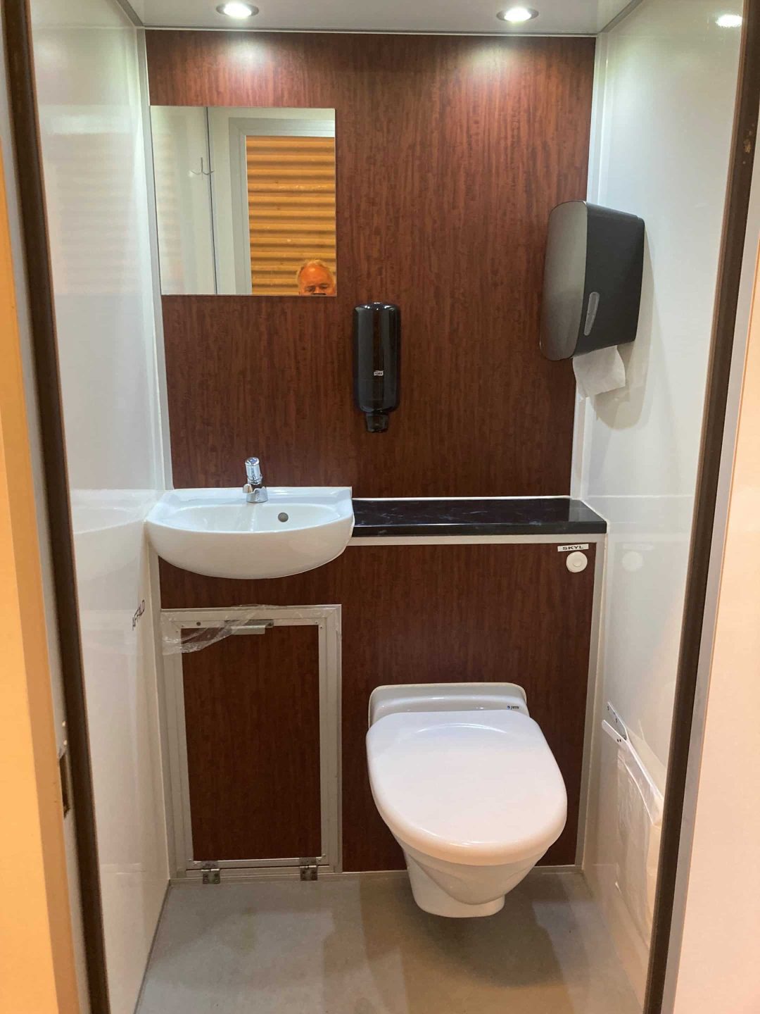 Vores FirstClass6 Vakuum modul er udstyret med 6 vakuumtoiletter med separate indgange fra det fri. Hvert rum er udstyret med en håndvask med indbygget “vip ud” papirkurv under vasken. Denne model er beklædt med træ-lignende materiale hvilket giver et eksklusivt look.