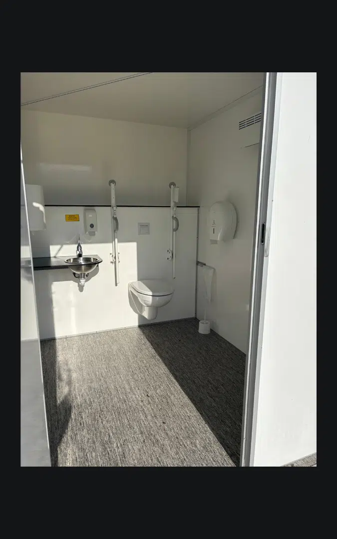 Dette smarte og kompakte handicapmodul er udstyret med toilet og håndvask. Der er placeret 2 støttebøjler på væggen bag toilettet som han foldes ned for ekstra stabilitet. Modulet placeres direkte på jorden med rampe for handicapvenlig adgang. Modulets kompakte natur gør det også fungerer optimalt til arrangementer med begrænset plads. Modulet er ikke udstyret med indbygget kværnpumpe, men dette kan lejes separat ved siden af.